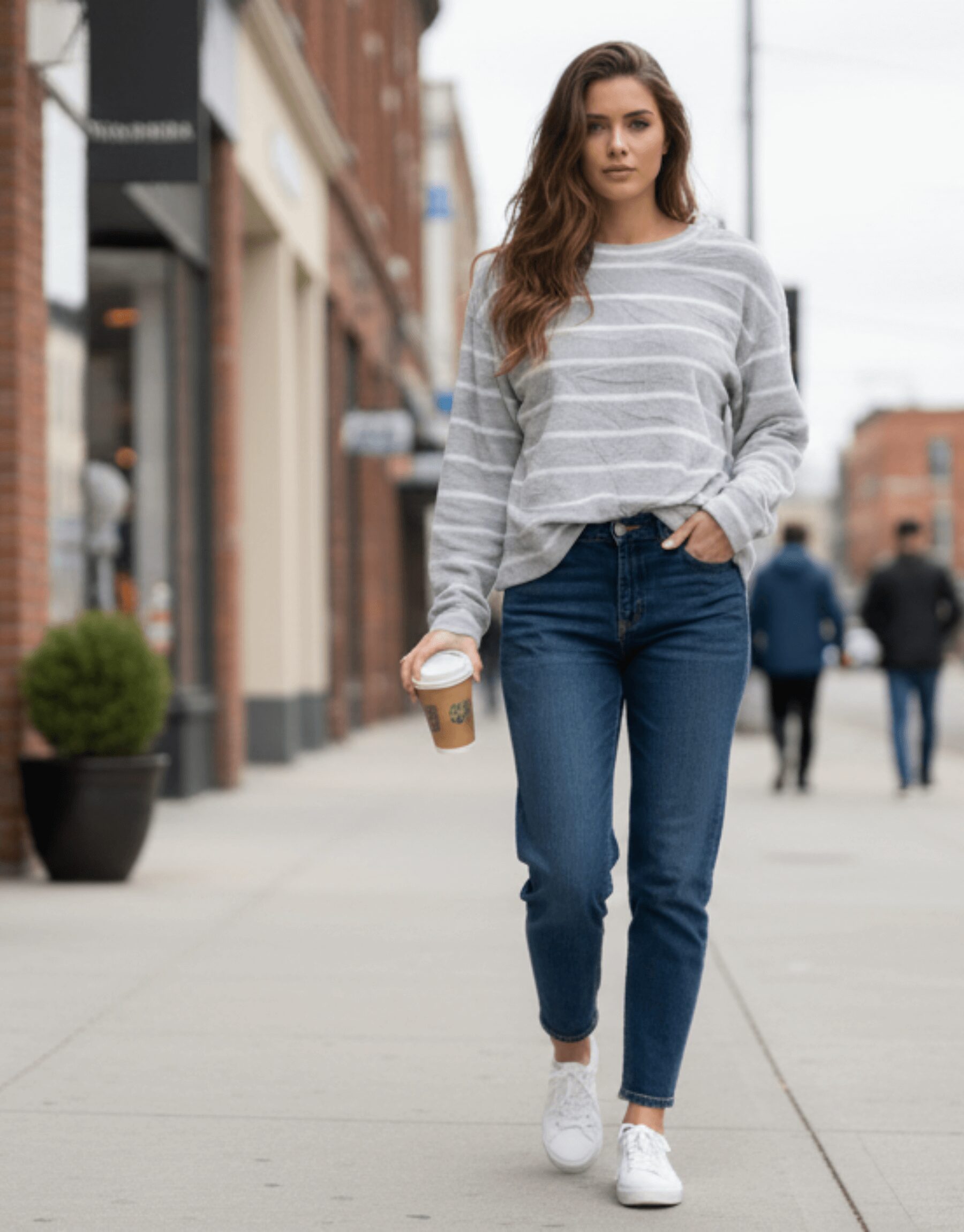 Grey Horizontal Striped Long-Sleeve Crewneck Top – Soft Casual Sweatshirt
