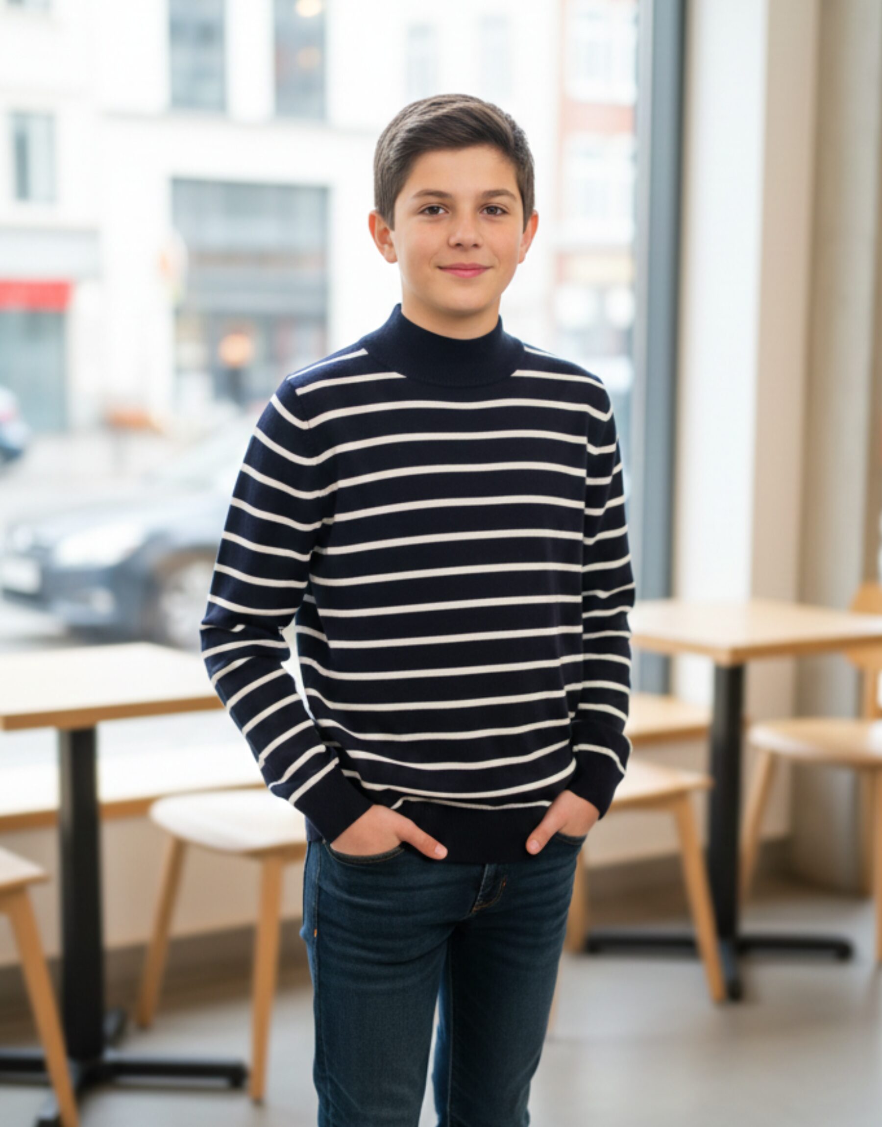 Elevate your wardrobe with our premium navy and white striped knit. Featuring a modern mock-neck and ultra-soft luxury finish. Shop timeless style today.