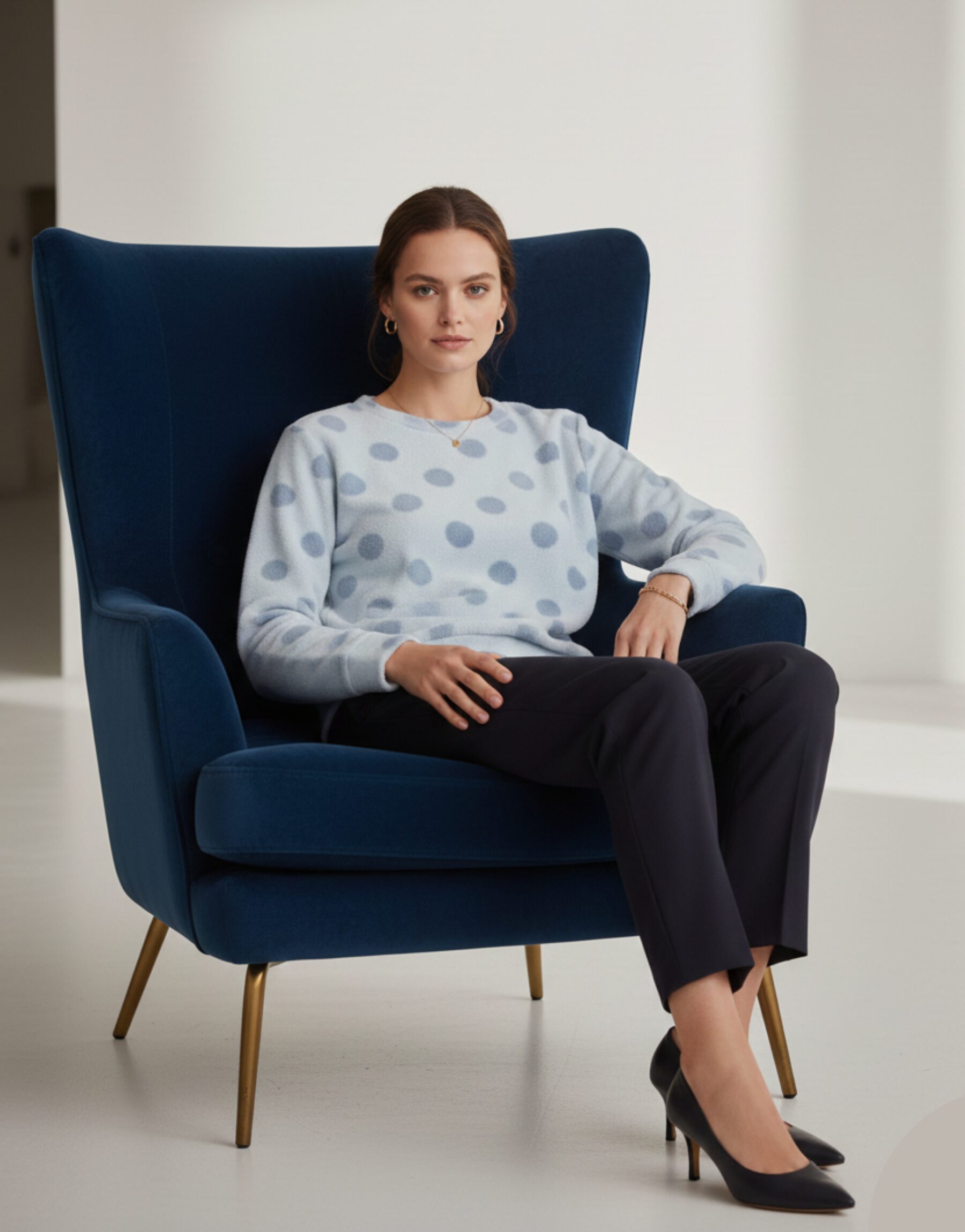 Featuring a contemporary muted blue palette with deep indigo polka dots, this sweatshirt transitions seamlessly from a relaxed morning at home to a polished afternoon in the city. The ribbed cuffs and hem provide a structured silhouette, while the natural thermoregulating properties of lambswool make it a versatile staple for every season.