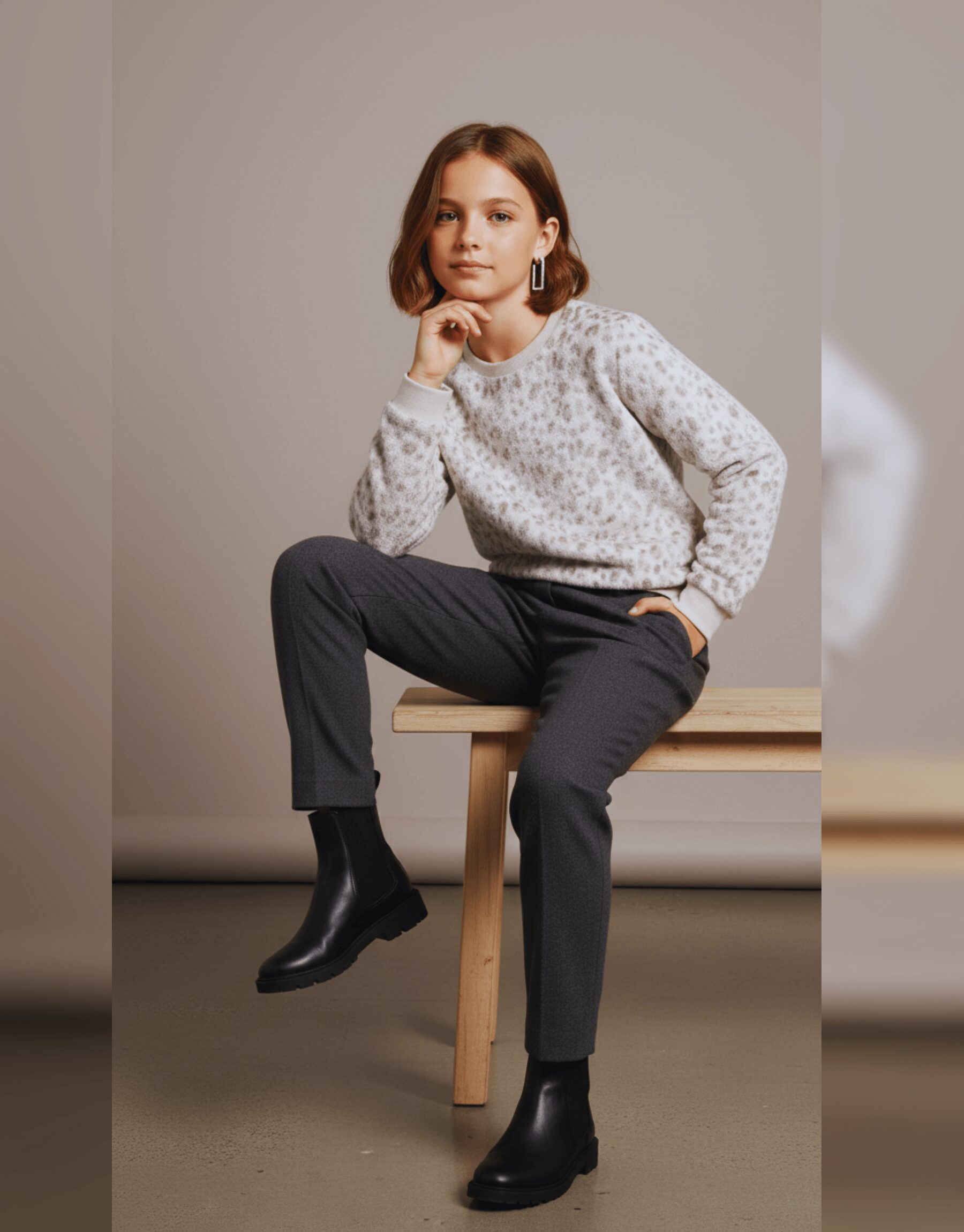 Designed for the young trendsetter who is transitioning into more mature, high-fashion styles, this piece combines the timeless allure of leopard print with the refined, muted tones of a professional editorial. Whether she is the star of a professional photoshoot or attending an upscale weekend event, this sweatshirt ensures she stays warm without compromising her growing sense of personal style.