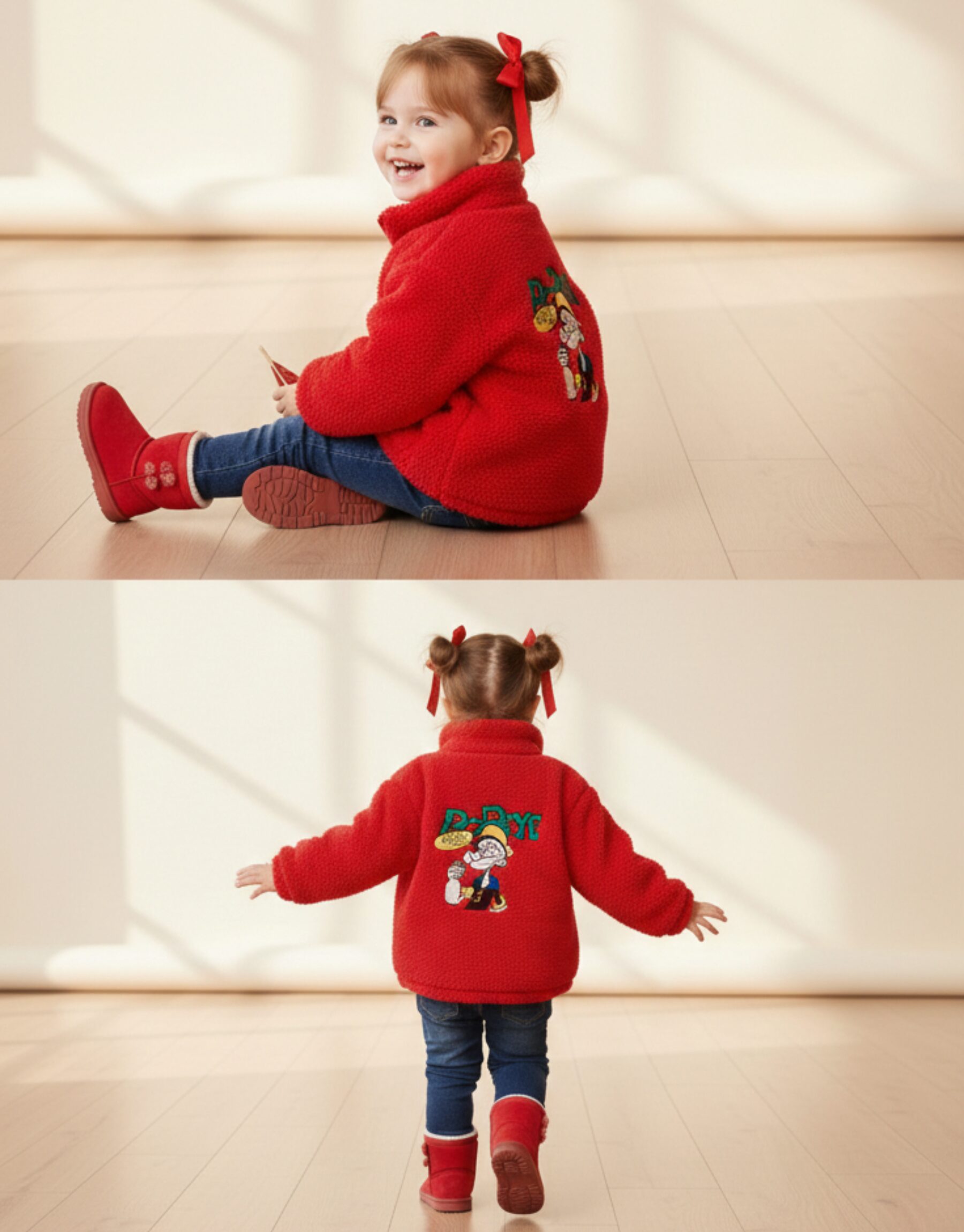 The ultimate statement piece for your little trendsetter. This luxury toddler girl’s red fleece jacket combines high-end comfort with iconic pop-culture style. Featuring a cozy white lining and a vibrant, professional-grade Popeye the Sailor Man embroidery on the back, it’s designed to stand out in photoshoots and on the playground alike. 3-6 years old range